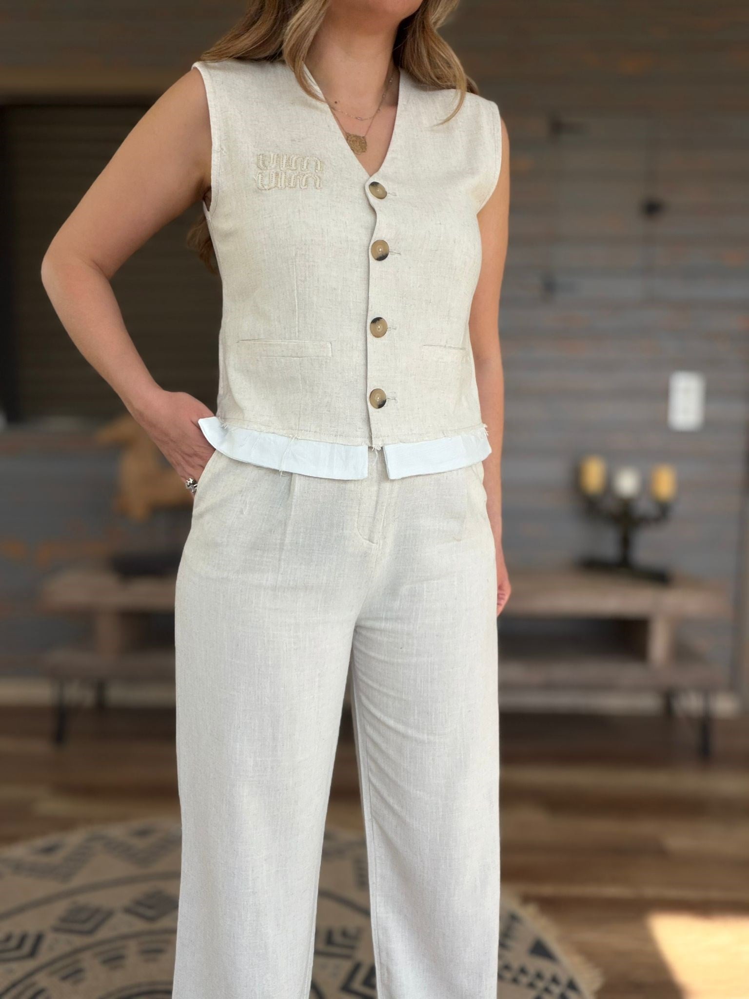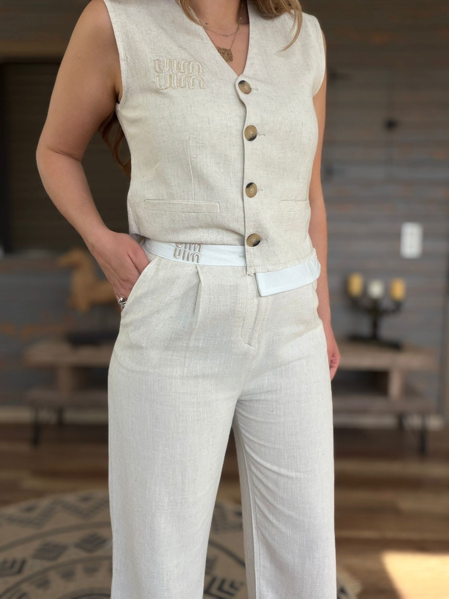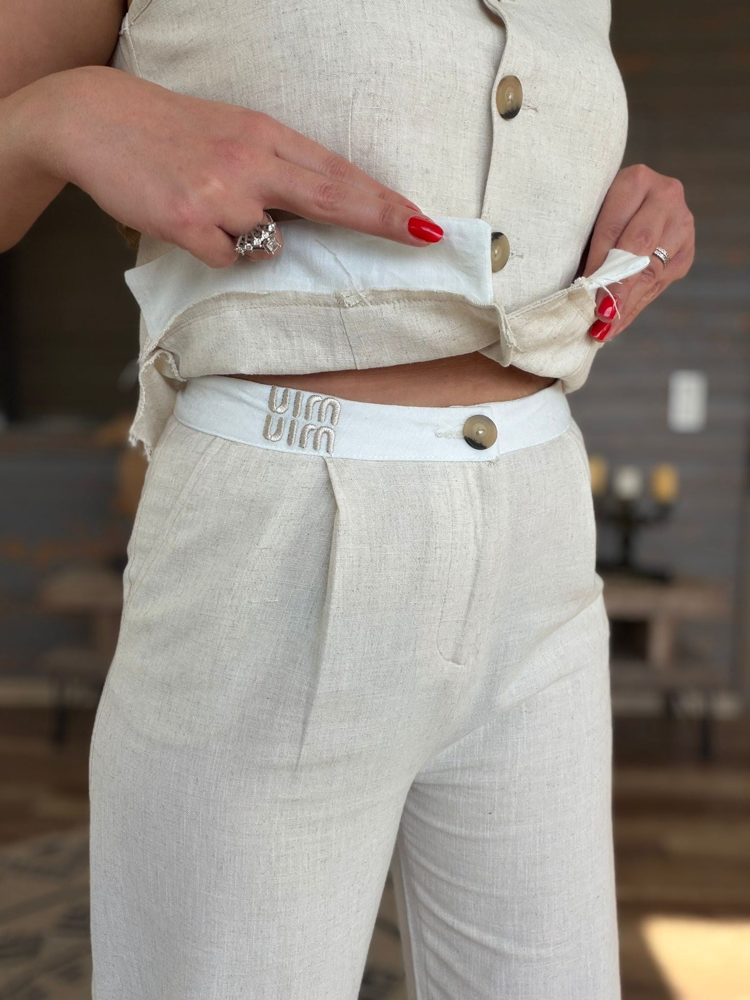 Aplike Nakış İşlemeli Keten Yelekli Takım (st007617)