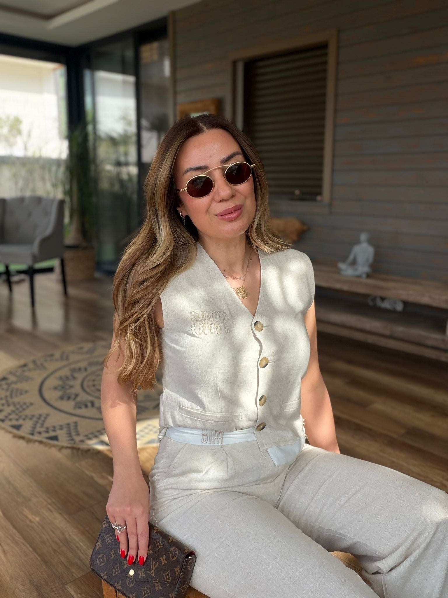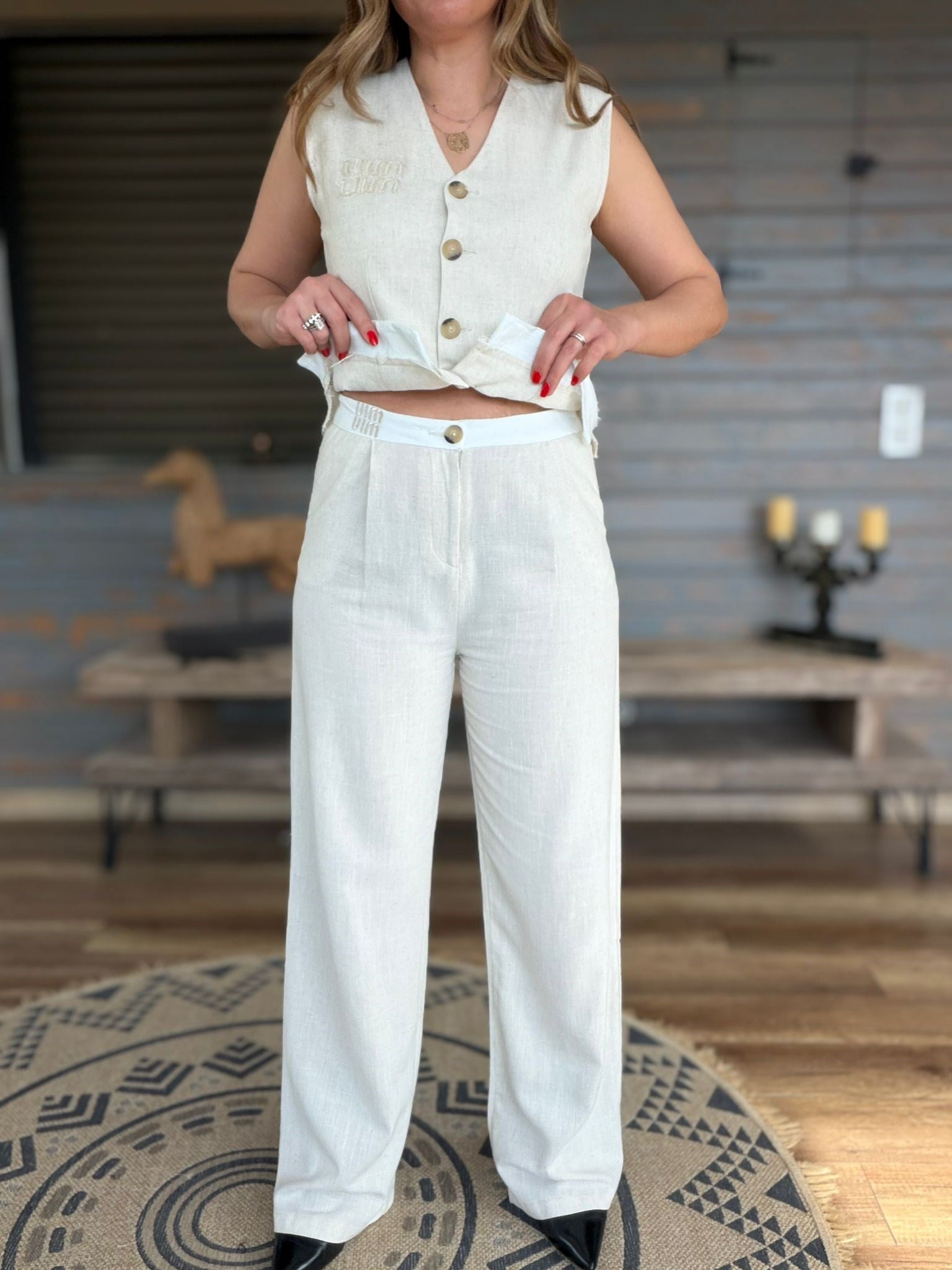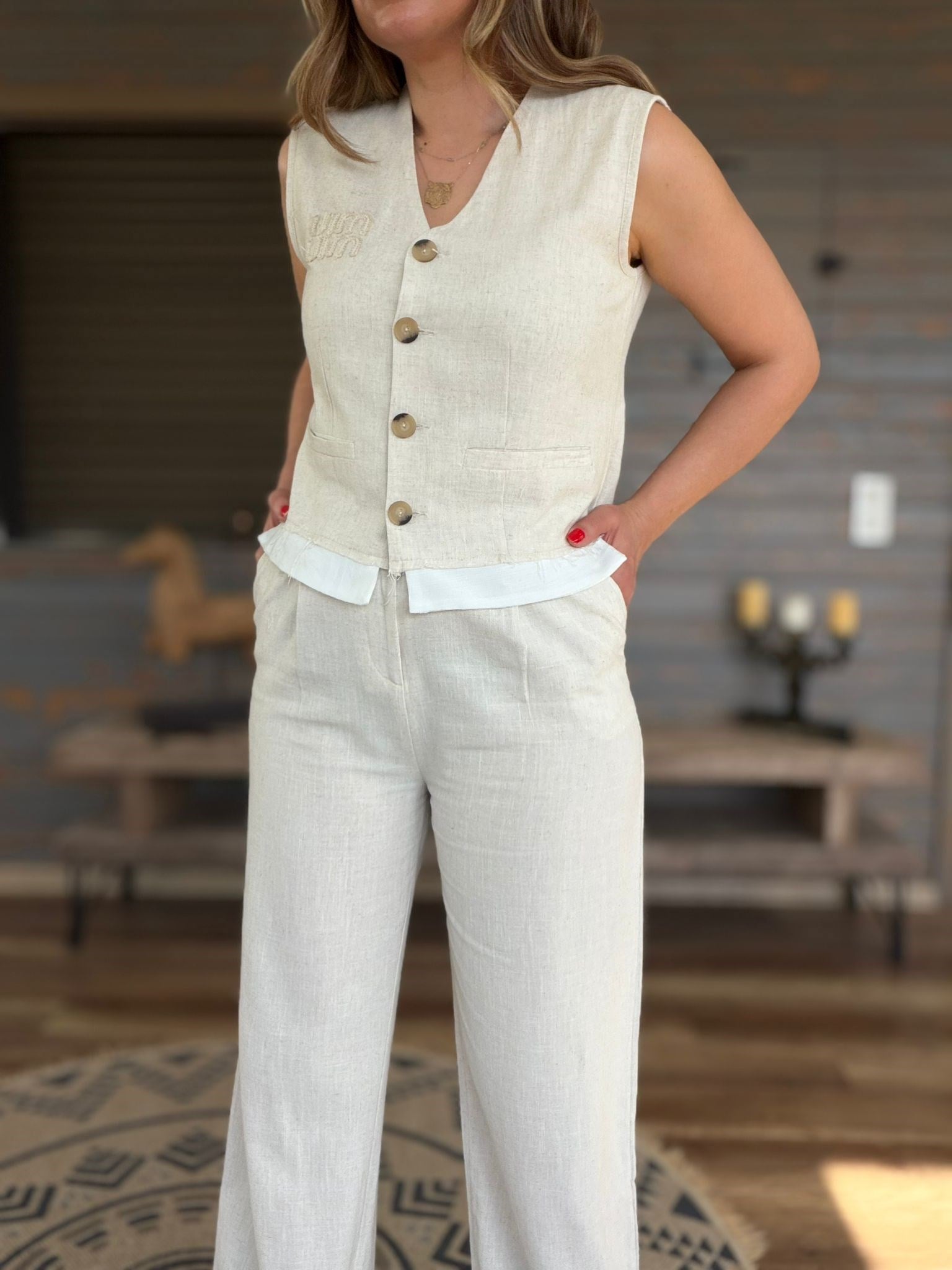 Aplike Nakış İşlemeli Keten Yelekli Takım (st007617)